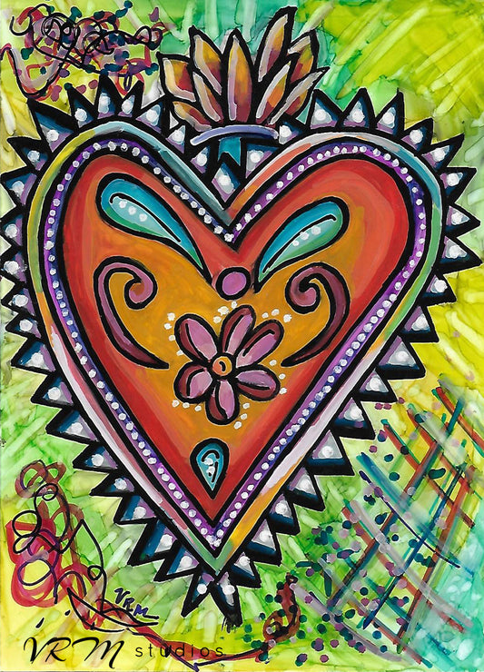 Hearts on Fire, original folk art painting on photo paper, matted, 11x14 inches